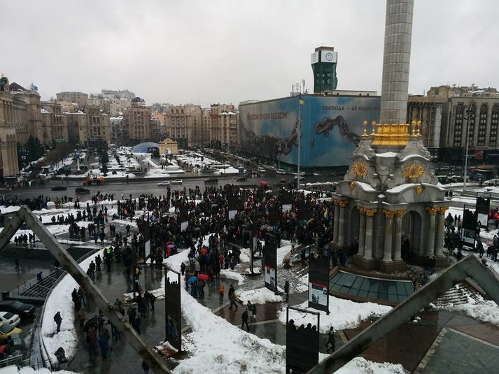 У Києві на Майдані Незалежності зібрались прихильники діючого президента Петра Порошенка. Багато хто п’є каву. Учасники зібрання також оприлюднили фото, на якому мітингарі їдять торт марки «Рошен» «Київський».