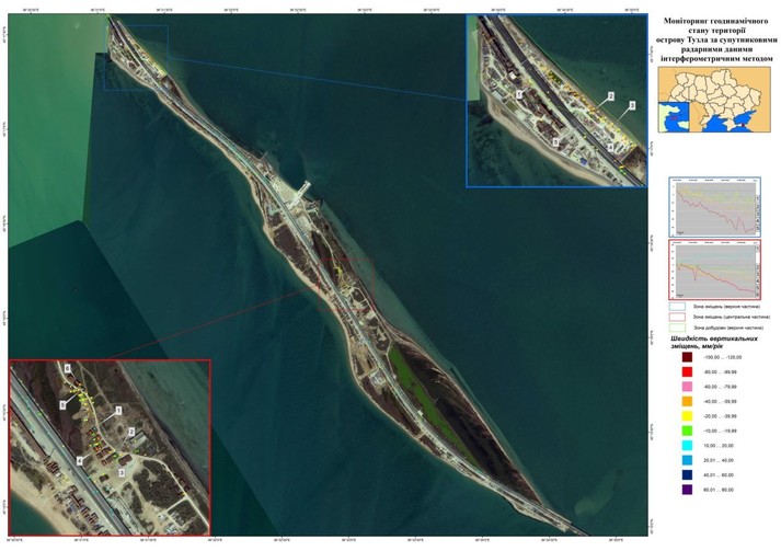 Крім того, зауважили у МінТОТ, на території острова Тузла частина коси просідає зі швидкістю від 10 до 90 міліметрів на рік, а об’єкти поруч з ділянкою мосту просідають зі швидкістю до 83 міліметрів на рік.