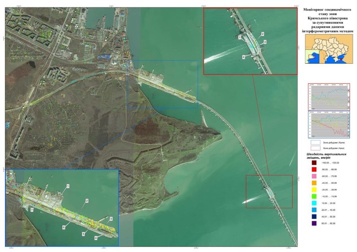 Зокрема, за їхніми даними, у районі штучного насипу з боку Кримського півострова відмічаються об’єкти з вертикальними зміщеннями зі швидкістю від 89 міліметрів (просідання) до 52 міліметрів на рік (підняття).