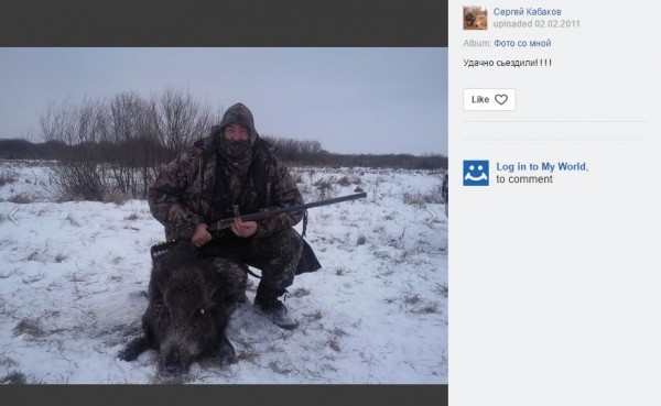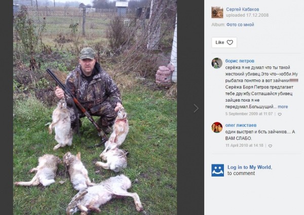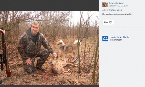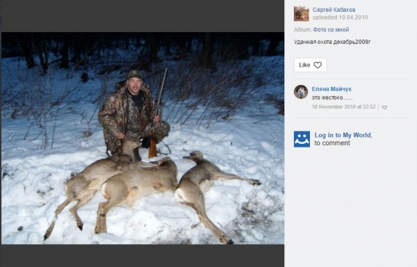 На своїй сторінці в російській соціальній мережі Mail.ru Кабаков викладає фото з упольованими тваринами.