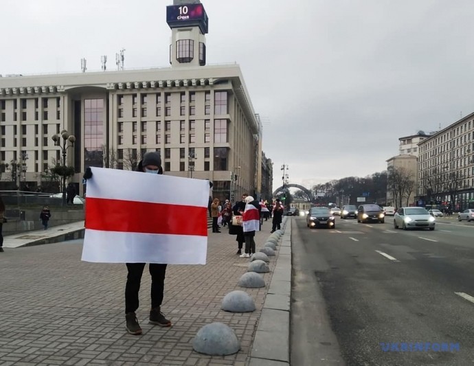 Сьогодні біля пів сотні людей з білоруськими національними біло-червоно-білими прапорами та плакатами вишикувалися вздовж вулиці Хрещатик з боку Головпоштамту. Як , рохповів «Укрінформу» один з учасників акції, громадянин Білорусі Юрій Щучко, щонеділі в Києві проходять подібні акції солідарності, коли учасники маршем до посольства Республіки Білорусь в Україні на вул. Коцюбинського. Зважаючи на посилення українською владою карантинних обмежень, сьогодні вирішили влаштувати саме «ланцюг солідарності».