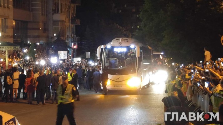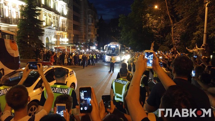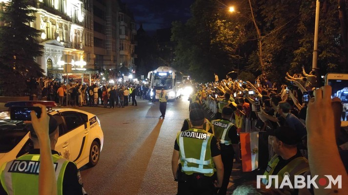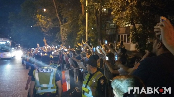 Сотні вболівальників зустрічають футболістів біля готелю.