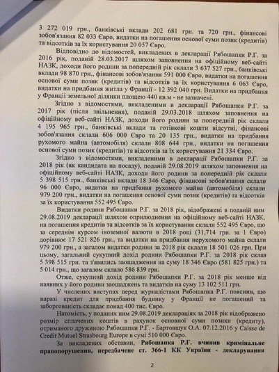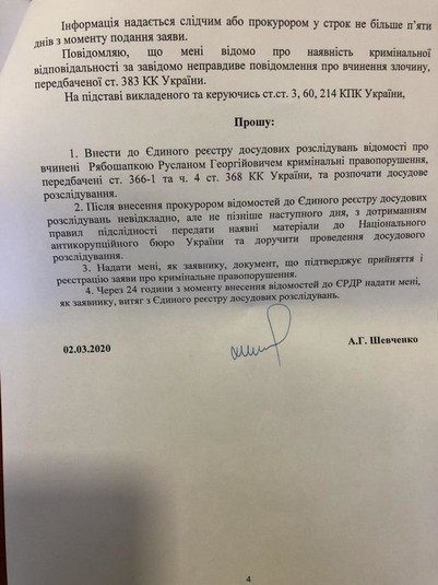 На думку Шевченка, у діях Рабошапки є ознаки злочинів, передбачених статтями 366-1 (декларування недостовірної інформації) та частини 4 статті 368 (прийняття пропозиції, обіцянки або одержання неправомірної вигоди службовою особою, яка займає особливо відповідальне становище) КК України.