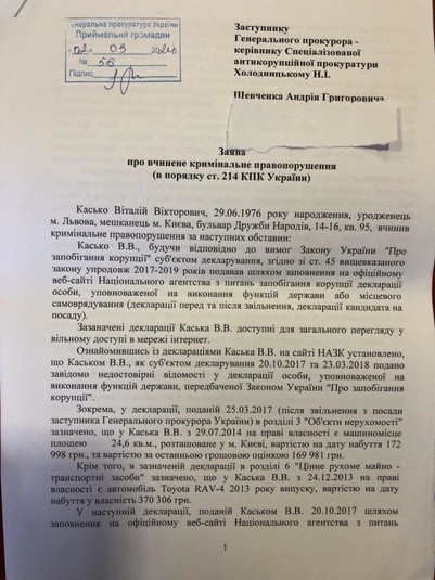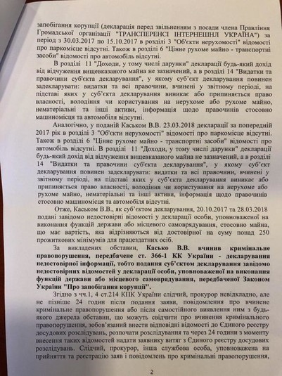 Що ж стосується Каська, то, на думку Шевченка, він має бути притягнути до кримінальної відповідальності за ознаками статті 366-1 (декларування недостовірної інформації) КК України.