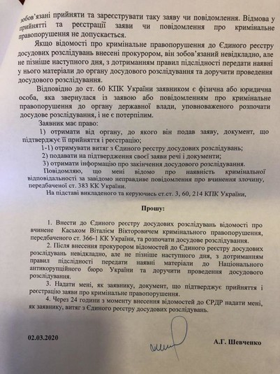 Колишній заступник начальника відділу Генеральної прокуратури України Андрій Шевченко 2 березня 2020 року звернувся до Спеціалізованої антикорупційної прокуратури з заявами про кримінальні правопорушення, вчинені генеральним прокурором Русланом Рябошапкою та його першим заступником Віталієм Каськом.