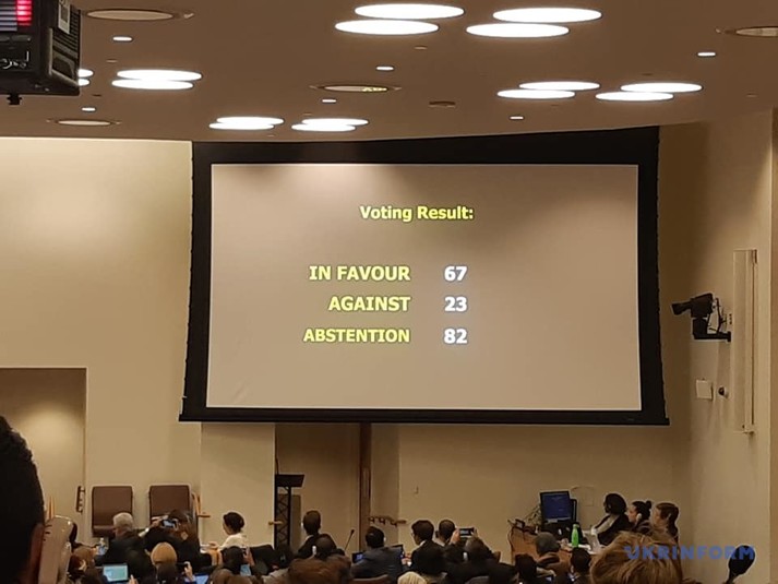 Як повідомляє Укрінформ з Нью-Йорку, «за» проголосували 67, проти 23, утрималися 82 учасника.