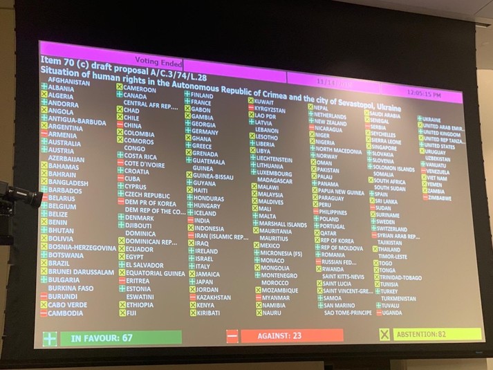 Третій комітет Генасамблеї ООН схвалив проєкт резолюції «Ситуація з правами людини в Автономній Республіці Крим та місті Севастополь, Україна», у якому щодо АРК вперше застосовано визначення «агресія».