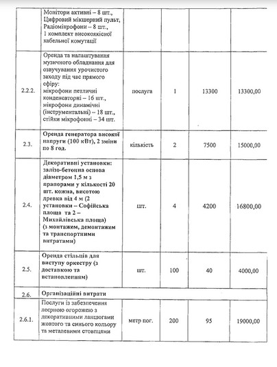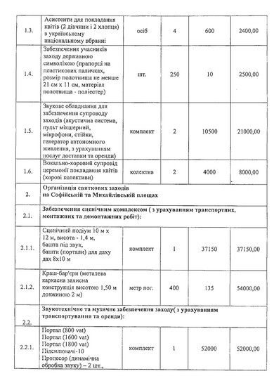 Кошторис урочистостей на Софіївській площі за державний рахунок