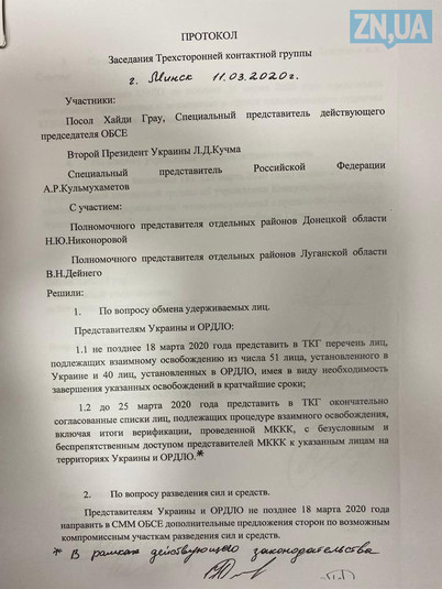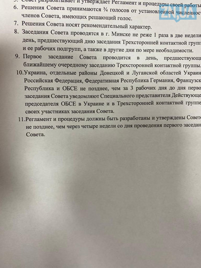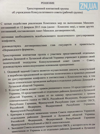 У розпорядженні zn.ua є копії домовленості про створення Консультативної ради, участь у якій братимуть представники ОРДЛО, а Росія стане гарантом-спостерігачем нарівні з Німеччиною, Францією і ОБСЄ.