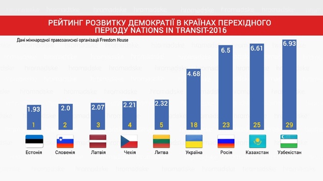 Нагадаємо, в щорічному дослідженні Nations in Transit-2016, яке опублікувала міжнародна правозахисна організація Freedom House, Україна посіла 18 місце з 29 можливих у рейтингу розвитку демократії серед пост-комуністичних країн.