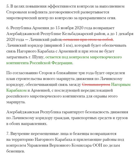 У ніч на 10 листопада президенти Азербайджану і Росії та прем'єр-міністр Вірменії підписали спільну заяву. Вони домовилися про припинення військових дій в Нагірному Карабасі і введення в регіон російського миротворчого контингенту. Першим текст заяви «без змін і скорочень» опублікував сайт новинного агентства «Sputnik Вірменія». Потім його передрукували багато інших ЗМІ. Кремль офіційно опублікував текст спільної заяви лише вдень, причому він відрізняється від початкового.