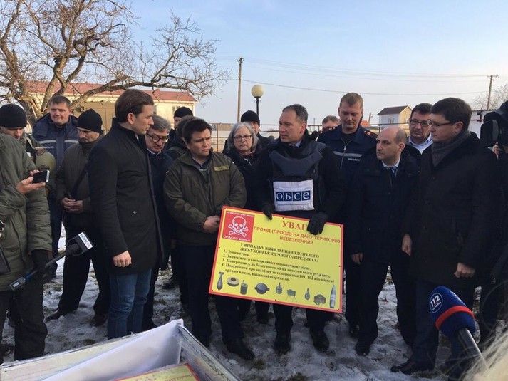 «Павло Клімкін та Себастьян Курц відвідали офіс СММ ОБСЄ в Маріуполі, контрольно-пропускний пункт в’їзду/виїзду «Пищевик» та с. Виноградне у Донецькій області. Міністри також оглянули навчальний проект МКЧХ з мінного ризику та взяли участь у церемонії передачі протимінних маркерів представникам мерії Маріуполя», - йдеться у повідомленні.