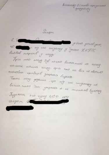 За його словами, ці факти були встановлені у зв'язку із розслідуванням розкрадань у навчальному закладі. Їх встановили військові прокурори Харківського гарнізону, які відвідали курсантську їдальню.