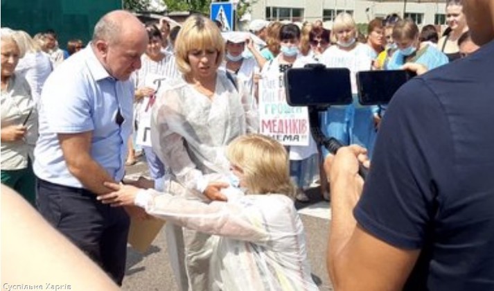 Серед вимог протестувальників – зміна керівництва лікарні. «Нового менеджера, нового економіста, нову головну медичну сестру», – написано на одному з плакатів. Під час акції медсестра Олександра Дуденкова, вимагаючи виплат, падала на коліна перед посадовцями. Один з чиновників її підняв.