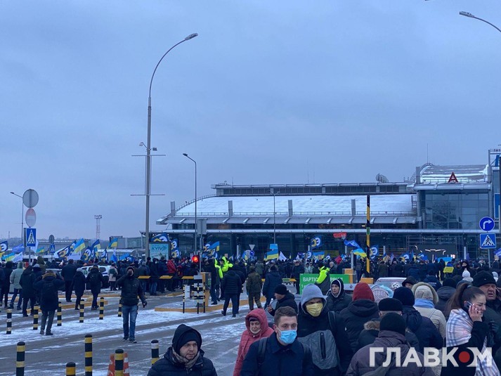 Біля «Жулян» зібралися кілька сотень прихильників лідера «Європейської солідарності». Вони стоять з прапорами біля входу до терміналу.