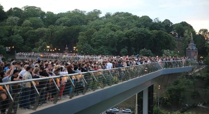 У День Києва, 26 травня, на новому пішохідно-велосипедний мосту між аркою Дружби народів і парк «Володимирська гірка», який відкрили напередодні ввечері в подарунок киянам, тріснуло скло на одному з оглядових майданчиків. Про це повідомляють «Українські новини».