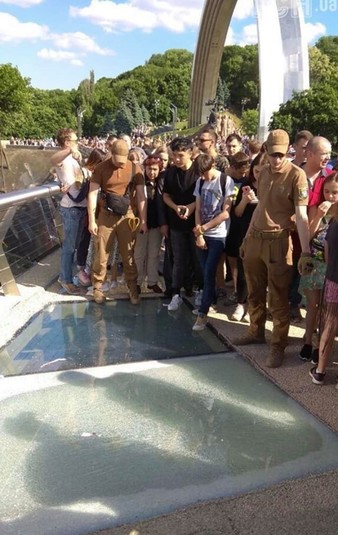 За словами поліцейського, який охороняє вхід на міст, скло тріснуло після того, як група невідомих активно на ньому стрибала. «Сьогодні міст працювати не буде», - повідомив він.