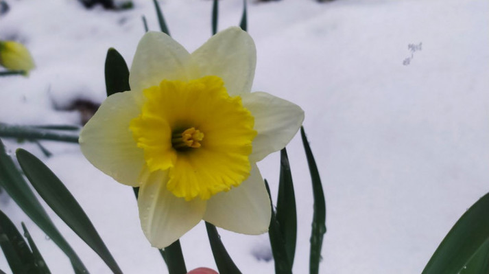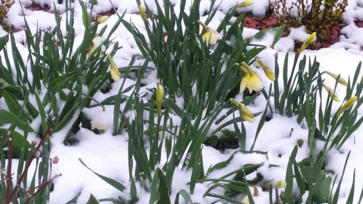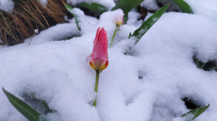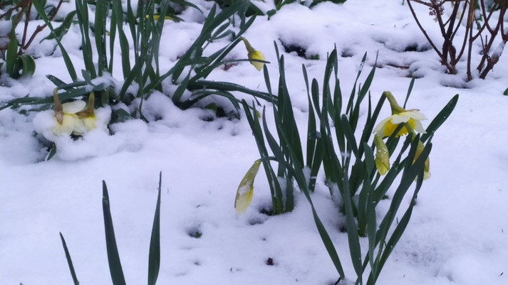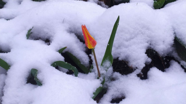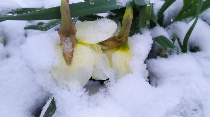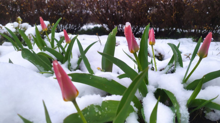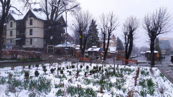 Сніг йде цілий день і засипав не тільки траву, а й нарциси і тюльпани, які розквітли у Трускавці (Львівська область).
