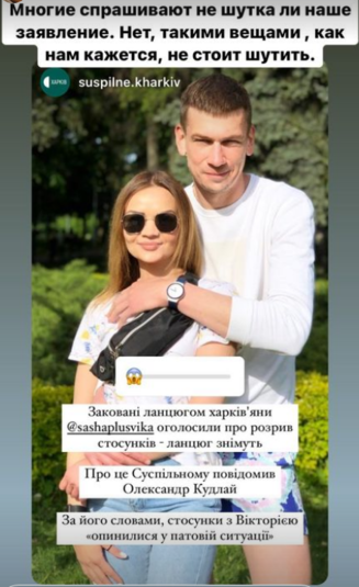 За його словами, стосунки з Вікторією «опинилися в патовій ситуації». На уточнення, чи це не жарт, Олександр відповів: «Зважене рішення. На жаль, ми не бачимо таких варіантів, закінчуємо гідно, зі взаємною повагою».
