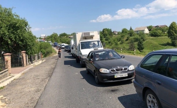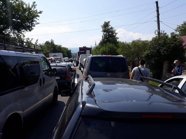 У напрямку до Буковеля утворився багатокілометровий затор в обох напрямках. У пробці стоять чотири автобуси з дітьми. Правоохоронці перекрили дорогу за півтора кілометра до протестувальників.