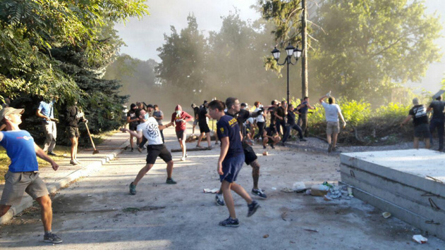 У Києві в Святошинському провулку 2, активісти гражданського корпусу «Азов» знову атакують будівельний майданчик «Київміськбуду». На місці події літають камені і фаєри. Про це говориться на сайті ГК «Азов».