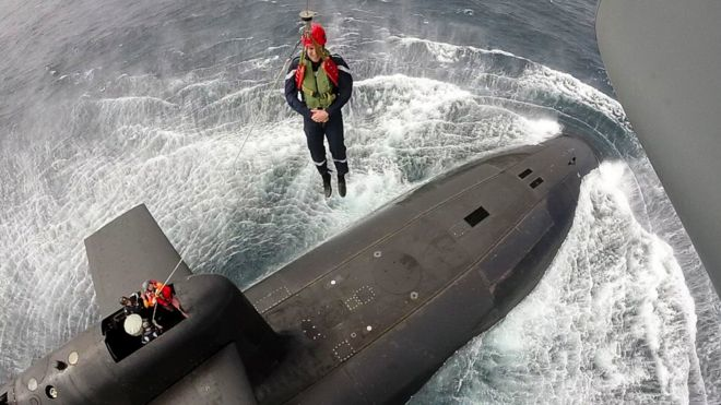 На підводний човен «Ле Террібль», що перебував за 300 км від узбережжя Великої Бретанії, Макрона опустили з вертольота. Пізніше французький президент опублікував у соцмережах фотографію спуску.