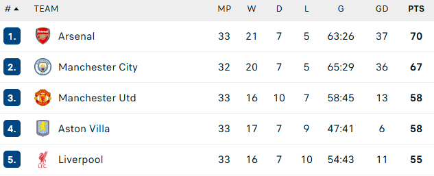 Після 33-го туру «Арсенал» залишається лідером турнірної таблиці. В активі команди Мікеля Артети 70 очок.