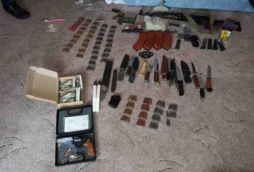 Під час санкціонованого обшуку в двох кімнатах і коридорі серед побутових і особистих речей правоохоронці вилучили мисливський карабін, 3 пістолети, 8 мисливських ножів, кастет, нунчаки, телескопічну палицю і більше 500 патронів різного калібру в пачках і розсипом.