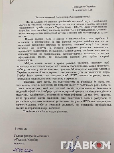 Низка громадських об’єднань працівників медичної галузі звернулися до президента Володимира Зеленського із проханням не допустити позаконкурсного призначення на посаду голови Національної служби здоров’я нефахової людини. Відповідний лист підписали голови 24-х об’єднань.