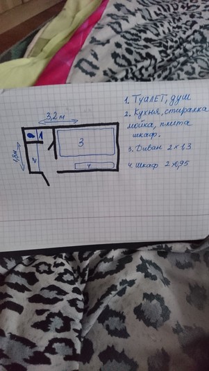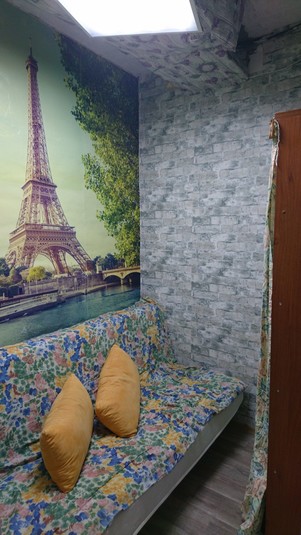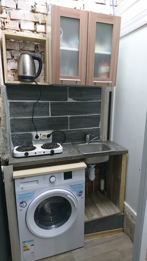 У квартирі розмістили бойлер, плиту для приготування їжі, батарею, пральну машину, душ та туалет. Також у неї втиснули диван та невеличку шафу. До речі, у приміщенні немає жодного вікна.