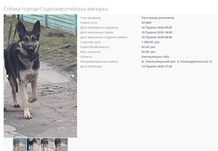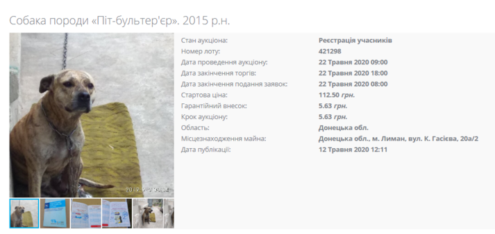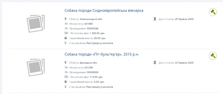 Так, згідно з інформацією, що міститься на сайті СЕТАМ, до уваги учасників торгів на 22 травня пропонується лот «Собака породи Пітбультер'єр» 2015 р. «зі стартовою ціною 112,5 грн, і на 25 травня лот «Собака породи Східноєвропейська вівчарка» з початковою ціною 1300 грн.