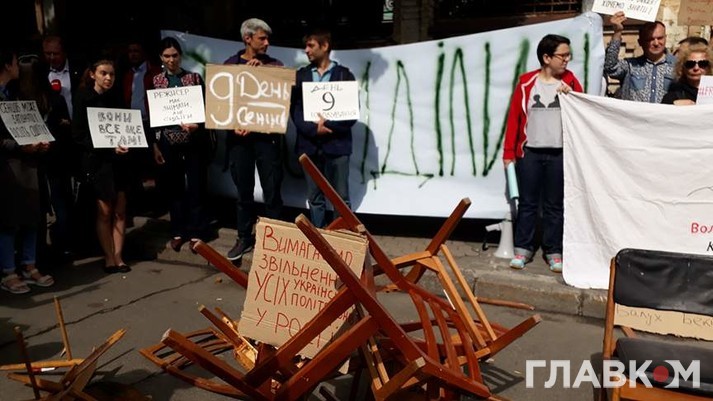 За словами протестувальників, сьогодні триває дев’ятий день голодування режисера, яке він розпочав з вимогою звільнити усіх українських політв’язнів у російських тюрмах.