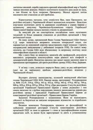 Представник РПЦ в Україні звертає увагу Зеленського на низку так званих проблем державно-релігійних відносин у Чернівецькій області: «Всупереч діючому законодавству, колишній в.о. голови ОДА Павлюк М.В. видав протиправні Розпорядження №№ 312-р, 354-р, 438-р, 441-р, 452-р, 458-р, 463-р, 479-р, 483-р, 764-р, 800-р, 828-р, 854-р, 855-р, 933-р «Про реєстрацію статутів релігійних організацій Української Православної Церкви у нових редакціях» і тим самим насильно та з грубим порушенням чинного законодавства перевів ряд релігійних громад з юрисдикції УПЦ МП до новоствореної організації — Православної церкви України».