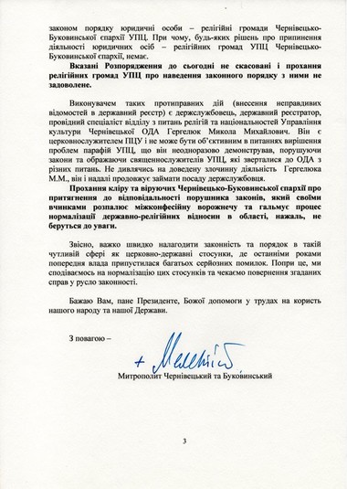 У листі московський священник скаржиться, що «внаслідок втручання політичних діячів та державних службовців у справи церкви в недавньому минулому Чернівецько-Буковинська єпархія УПЦ МП зазнала значних утисків та дискримінацій!.