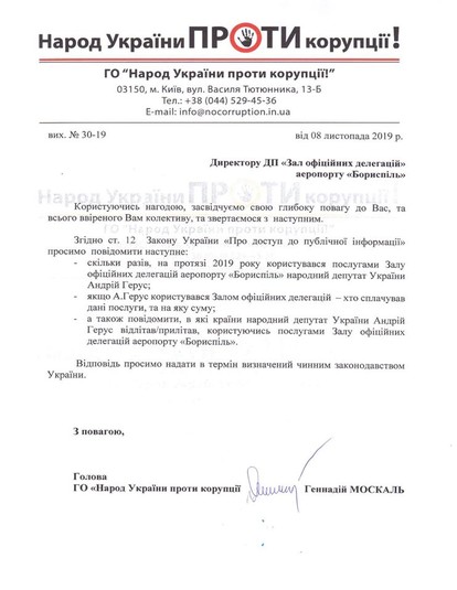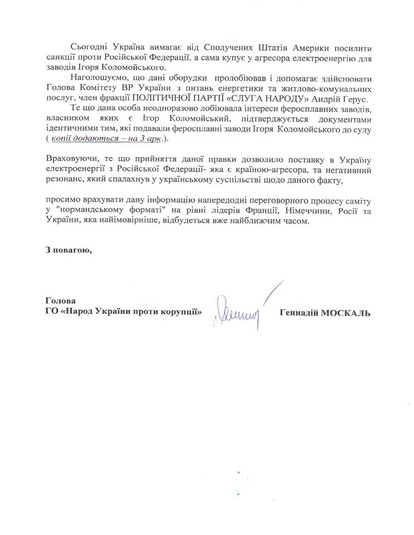 Напередодні можливого саміту у Нормандському форматі голова громадської організації «Народ України проти корупції» Геннадій Москаль звернувся з листами до послів Франції та Німеччині в Україні, відповідно, пана Етьєна де Понсена та пані Анки Фельдгузен, в яких повідомив про те, що поправка голови комітету Ради з питань енергетики та ЖКП Андрія Геруса, що відкрила імпорт електроенергії з Росії, впроваджена в інтересах олігарха Ігора Коломойського.