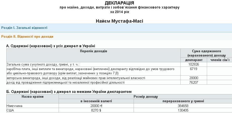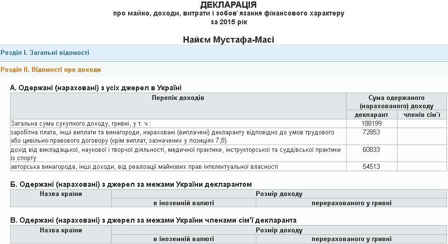 Згідно з документом, у 2015-му році депутат від БПП Мустафа-Масі Найєм задекларував річний дохід на суму 188 тисяч 199 гривень. Це значно менше зароблених загалом 617 тисяч гривень у 2014-му.