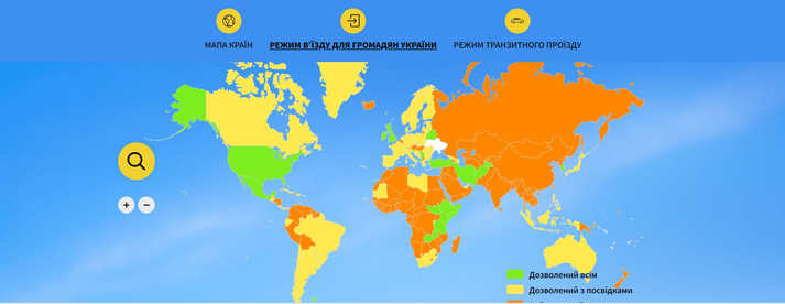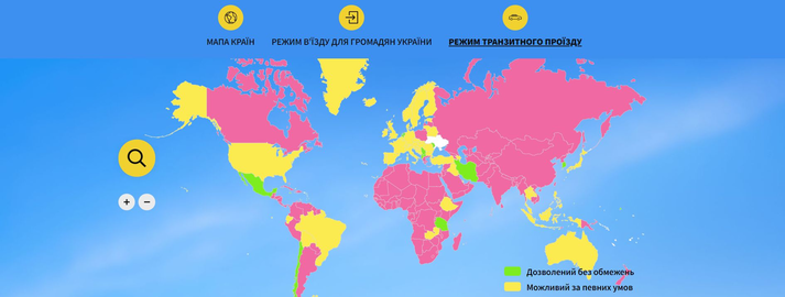Карта має два розділи: правила транзитного проїзду та правила в'їзду за кордон для громадян України. На карті різними кольорами показано, чи є обмеження для українців на перетин кордонів.