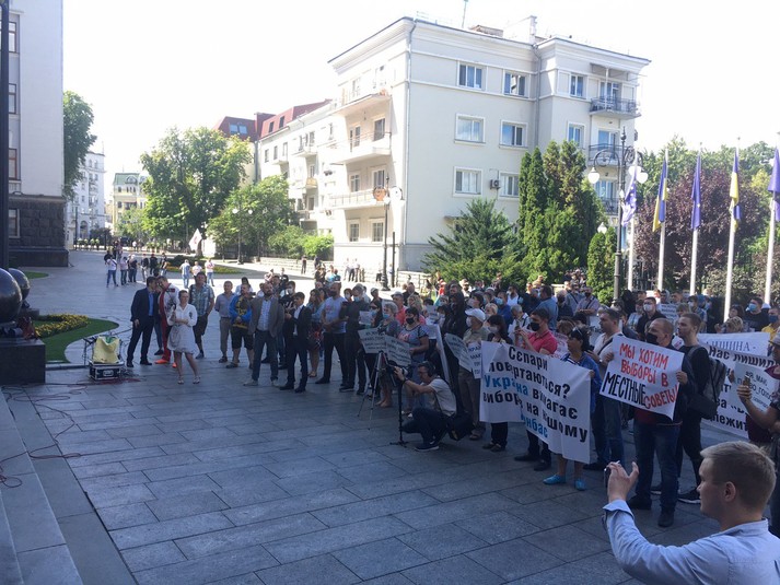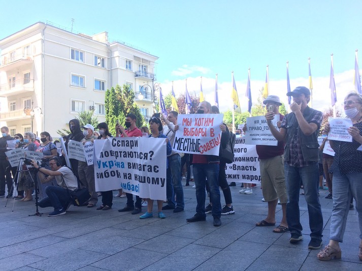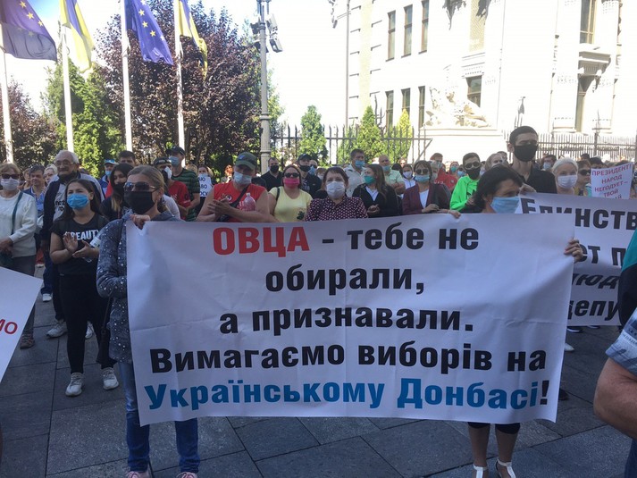 «Коли треба – перемир'я? Коли треба – війна? Вимагаємо виборів на українському Донбасі!», «Ні – виборам на окупованому Донбасі! Так – виборам на українському Донбасі!», «Ми воювали не за корупцію ОВЦА та ОПУ на Донбасі!». Під такими гаслами під Офісом Президента відбулася акція ветеранів АТО та українців Сходу, які вимагали проведення виборів в 10 ОТГ Донеччини та 8 Луганщини.