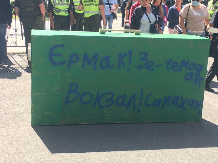 Протестувальника принесли валізу з надписом «Єрмак. Зе чемодан. Вокзал. Санахант», з якою їх зупинили біля входу на площу перед будівлею ОПУ.