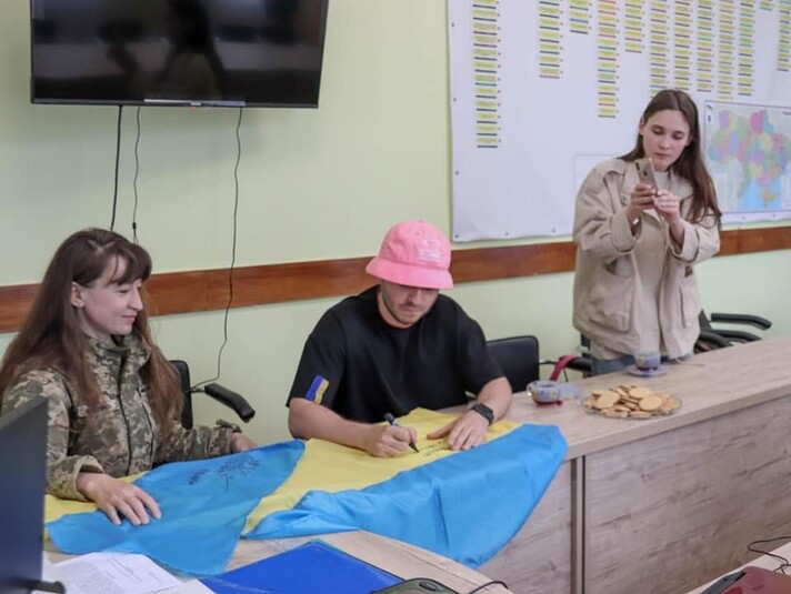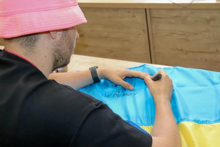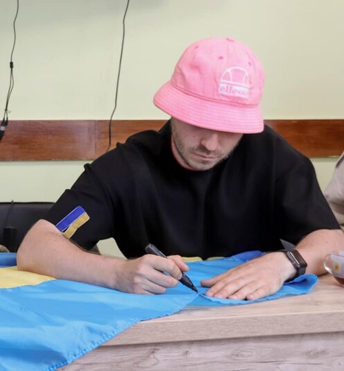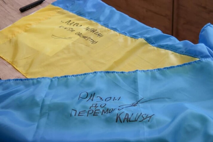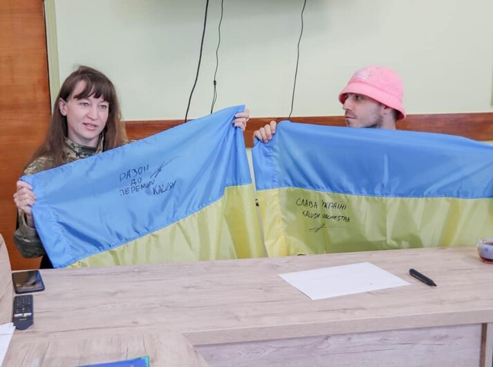 Лідер гурту Kalush Orchestra Олег Псюк підписав два прапори, які волонтери виставлять на аукціон для допомоги Збройним Силам України. Про це повідомила Калуська міська рада.