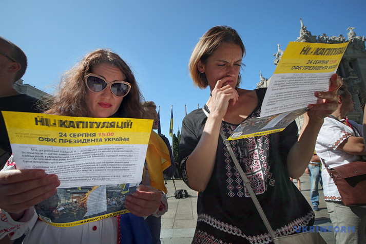 У Києві біля будівлі Офісу президента близько сотні активістів 24 серпня провели акцію «Ні - капітуляції».