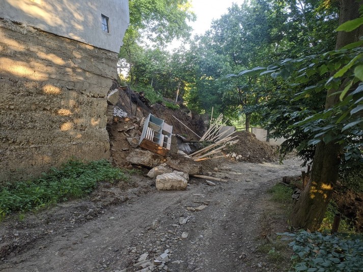 «Через постійні дощі, які були протягом останніх тижнів, грунт давив на бетон. Він не витримав і рухнув, за собою потягнув частину гаража. Ми телефонували в ДСНС, вони приїхали на наступний день вранці, глянули, знизили плечима і сказали триматися. Навіть не дали стрічок, щоб перегородити дорогу. Доводилося використовувати ті, які залишилися після весілля сина, класти свій дорожній знак. Бо ж боялися, що дорогою йтимуть люди, а воно може в будь-який момент далі обвалитися. Ми звернулися і до сільської ради. Там теж знизили плечима, мовляв грошей в бюджеті немає», – розповідає пан Сергій.