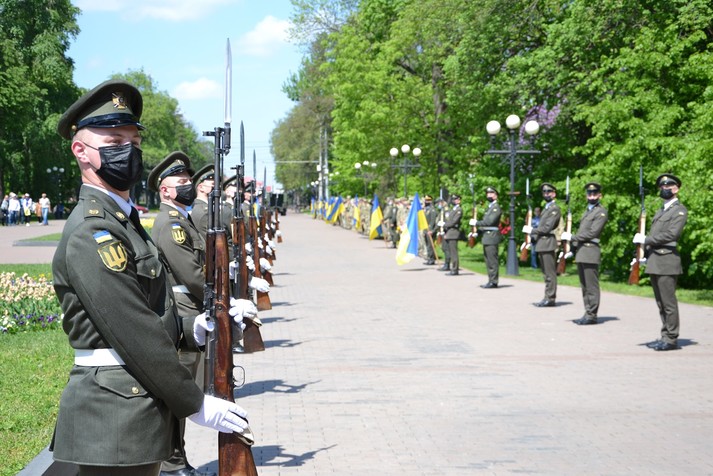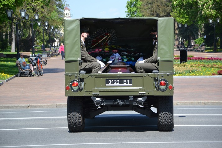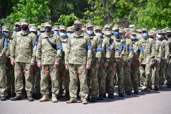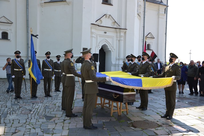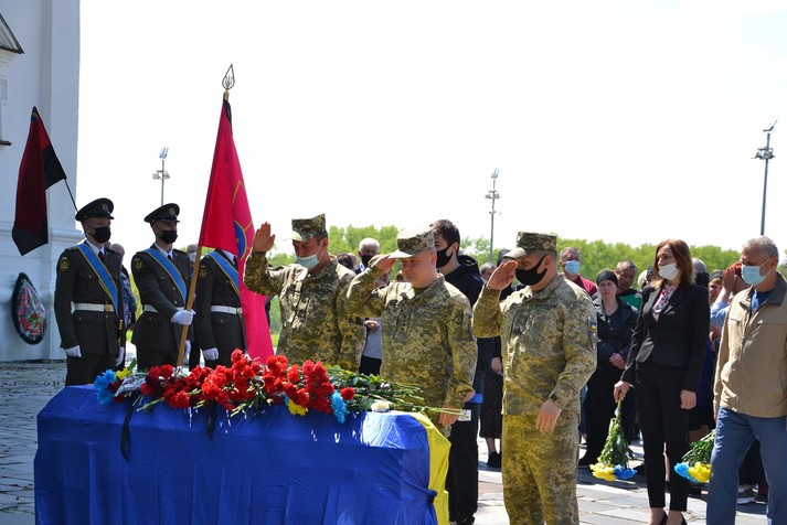 У храмі відбулась заупокійна літія, а після мітингу процесія попрямувала через коридор із сотень військовослужбовців, які схилили коліна, віддаючи шану загиблому військовослужбовцю.