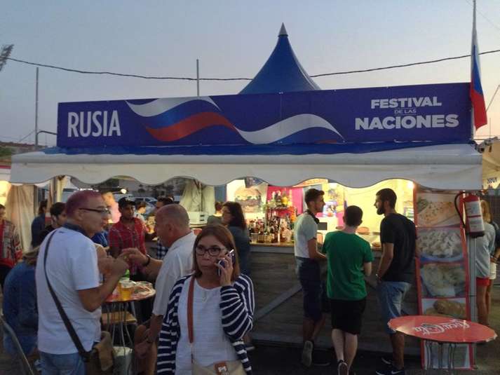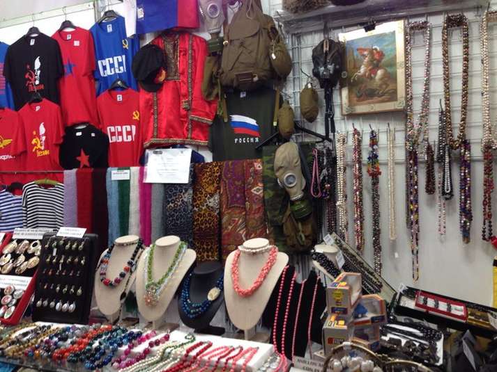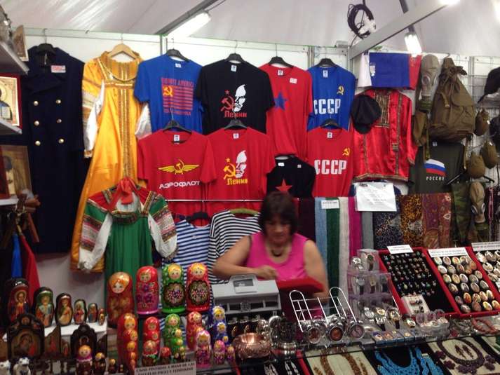 Як видно на світлинах, на фестивалі культур світу Росія також представила футболки з комуністичною і радянською символікою, матрьошки, фляги та протигази.