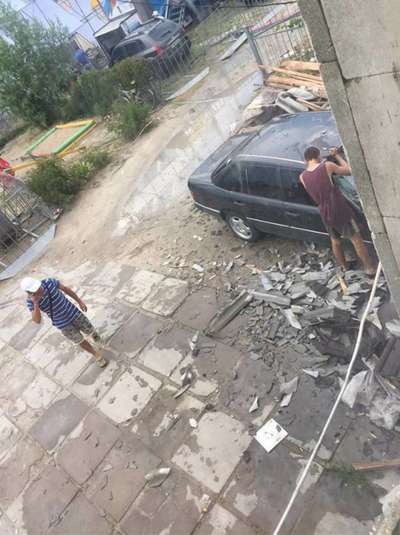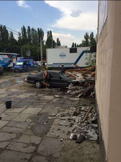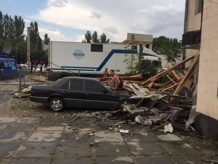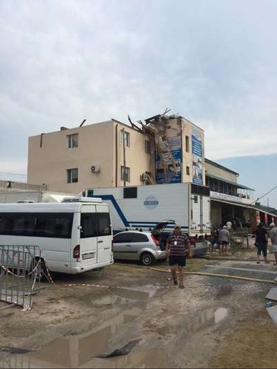 «Потужний вітер зніс дах, який впав на припарковані авто. Одна з машин належить орендарю готелю - Акуловичу. І хоч перед самим готелем стоїть сцена «Чорноморських ігор», але обійшлося (слава Богу) без жертв», – сповістив Власов.