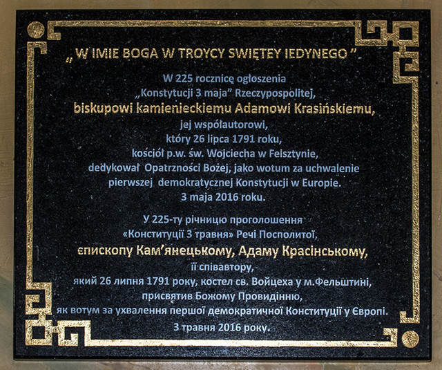 На час коли прийняли Конституцію в Фельштині готувалися освятити новий римо-католицький храм. Його чи не півстоліття зводили на місці спаленого татарами дерев'яного костелу Св. Войцеха. Від початку новий храм мали освятити іменем того ж самого святого, але на честь історичної події його вирішили присвятити Конституції, тож освятили на честь Провидіння Божого. 26 липня 1791 року обряд провів особисто єпископ Красінський.