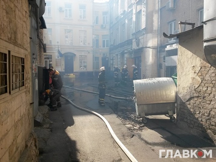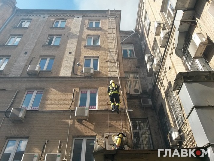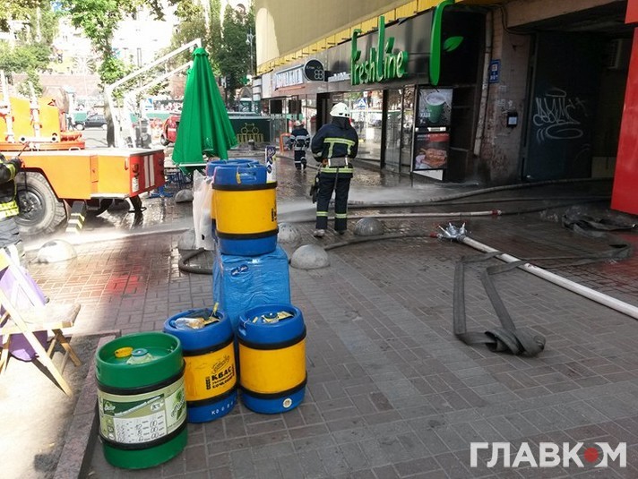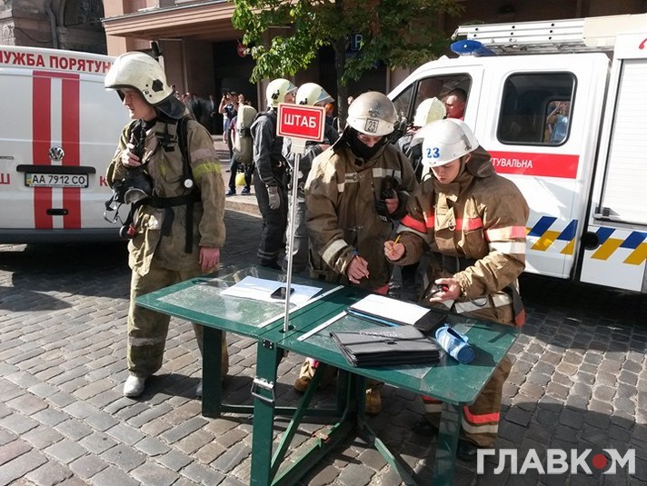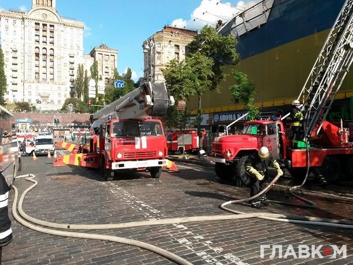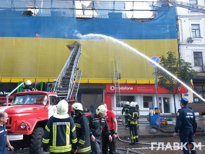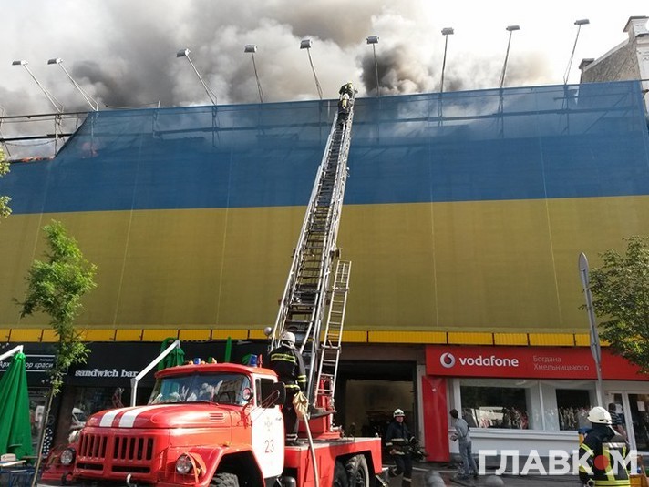 Рятувальники Державної служби з надзвичайних ситуацій України о 21:04 загасили пожежу на Хрещатику в Києві у будівлі колишнього центрального гастроному.