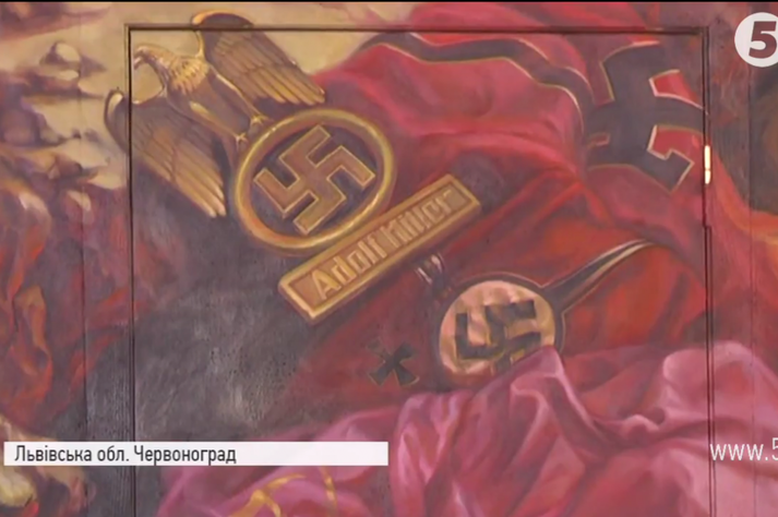 Композиція намальована навпроти фресок із ликами святих, при виході з церкви. На ній – пекельний вогонь, а у ньому горять грішники: радянська символіка, свастика нацистів та чоловік, схожий на президента Росії Володимира Путіна, повідомляє «5 канал».