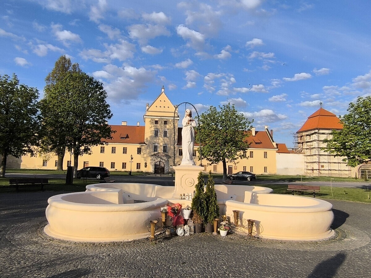 Площа Вічева – історичний центр Жовкви, міста на Львівщині, яке входить до числа найбагатших на архітектурні пам'ятки в Україні. Місто засноване у 1597 році, а у XVII столітті слугувало резиденцією короля Речі Посполитої Яна III Собеського. Архітектурний ансамбль площі, зведений ще в епоху Ренесансу, є охоронюваною культурною спадщиною. Фігура Матері Божої – один із сакральних елементів цього простору.