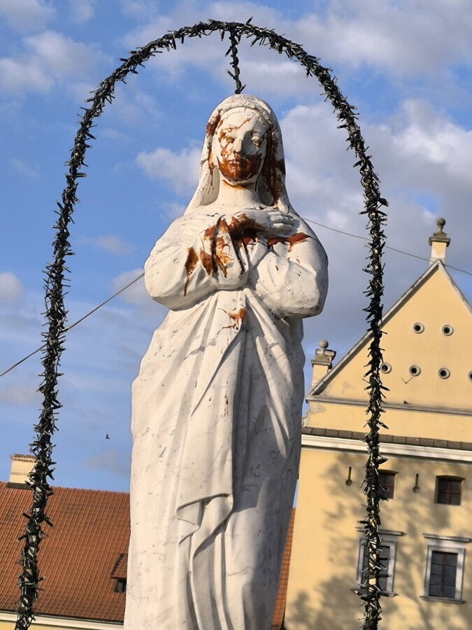 У Жовкві на Львівщині невідомі облили червоною речовиною фігуру Матері Божої, що стоїть на головній площі міста – Вічевій. Місцева влада назвала це першим в історії міста актом вандалізму над релігійною святинею і звернулася до Національної поліції. Про це повідомляє «Главком» з посиланням на Facebook-сторінку керівника КП «Жовківське МВУЖКГ» Ігоря Муравського.